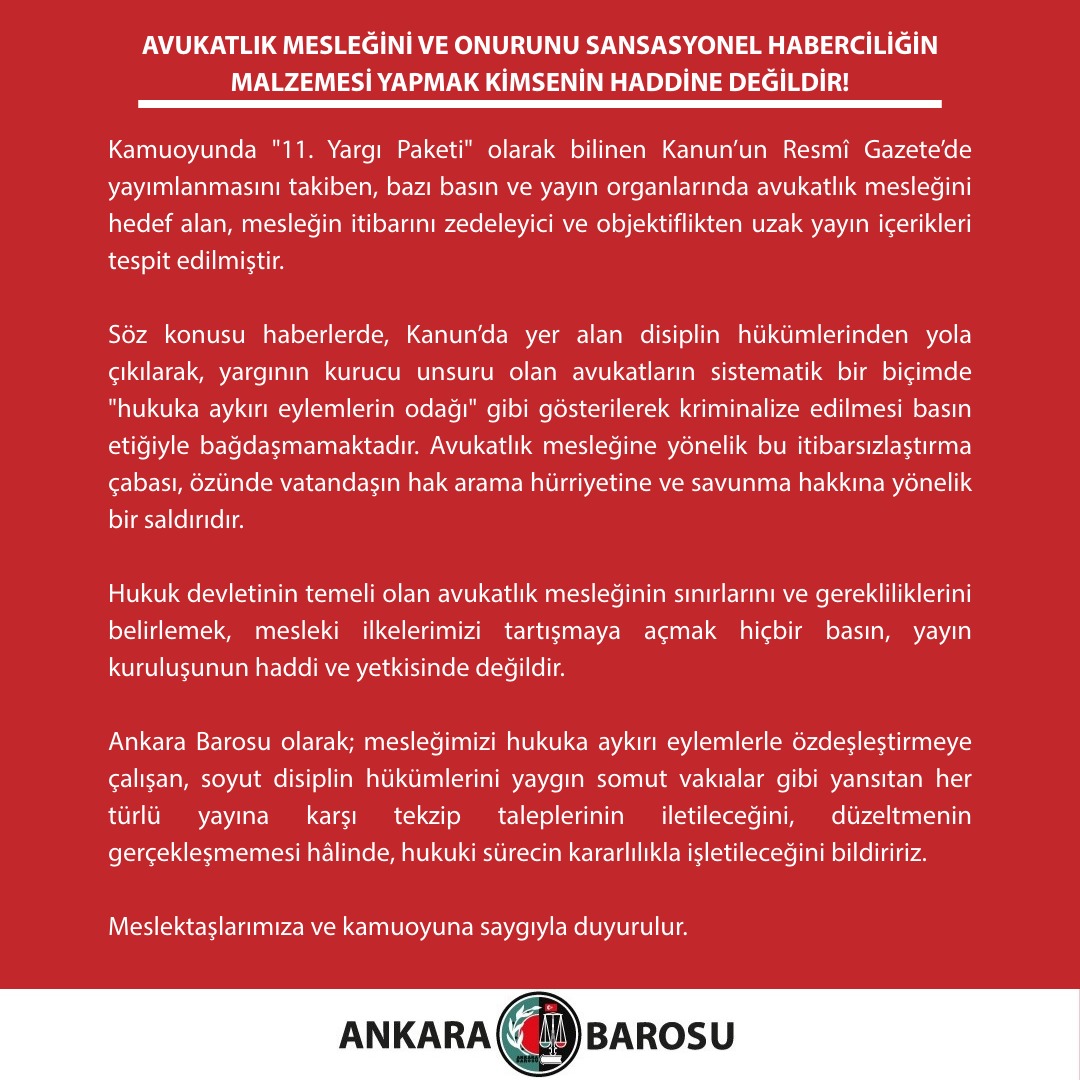 Ankara Barosu olarak; mesleğimizi hukuka aykırı eylemlerle özdeşleştirmeye çalışan, soyut disiplin hükümlerini yaygın somut vakıalar gibi yansıtan her türlü yayına karşı tekzip taleplerinin iletileceğini, düzeltmenin gerçekleşmemesi hâlinde, hukuki sürecin kararlılıkla işletileceğini bildiririz.