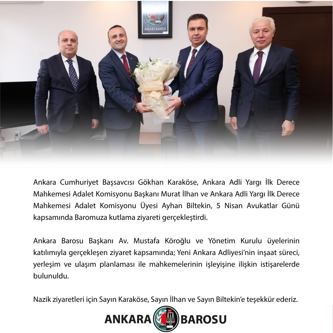 Ankara Cumhuriyet Başsavcısı Gökhan Karaköse, Ankara Adli Yargı İlk Derece Mahkemesi Adalet Komisyonu Başkanı Murat İlhan ve Ankara Adli Yargı İlk Derece Mahkemesi Adalet Komisyonu Üyesi Ayhan Biltekin, 5 Nisan Avukatlar Günü kapsamında Baromuza kutlama ziyareti gerçekleştirdi.
