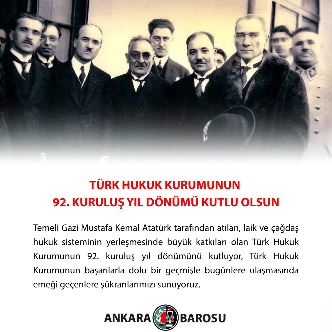 Temeli Gazi Mustafa Kemal Atatürk tarafından atılan, laik ve çağdaş hukuk sisteminin yerleşmesinde büyük katkıları olan Türk Hukuk Kurumunun 92. kuruluş yıl dönümünü kutluyor, Türk Hukuk Kurumunun başarılarla dolu bir geçmişle bugünlere ulaşmasında emeği geçenlere şükranlarımızı sunuyoruz.