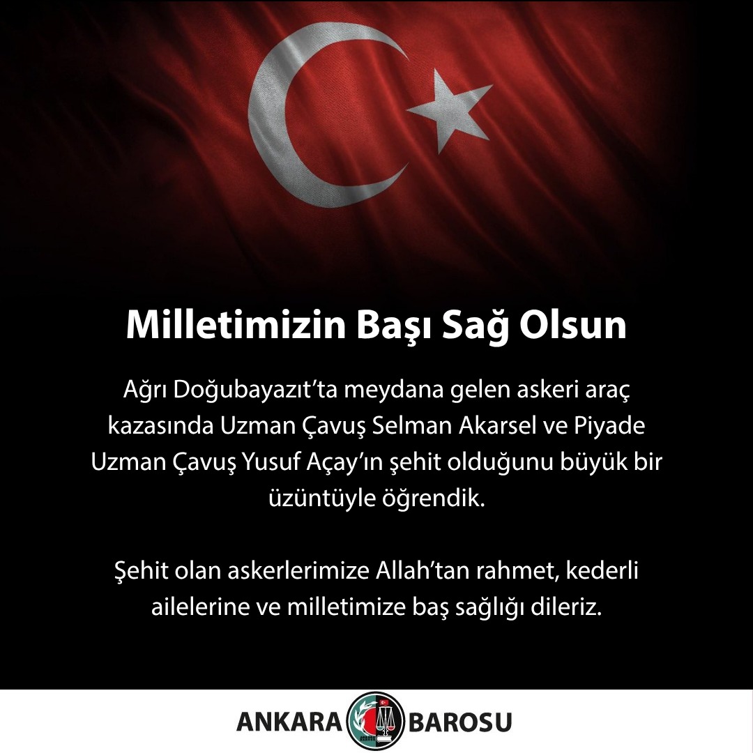 AĞRI DOĞUBAYAZIT’TA MEYDANA GELEN ASKERİ ARAÇ KAZASINDA UZMAN ÇAVUŞ SELMAN AKARSEL VE PİYADE UZMAN ÇAVUŞ YUSUF AÇAY’IN ŞEHİT OLDUĞUNU BÜYÜK BİR ÜZÜNTÜYLE ÖĞRENDİK. ŞEHİT OLAN ASKERLERİMİZE ALLAH’TAN RAHMET, KEDERLİ AİLELERİNE VE MİLLETİMİZE BAŞ SAĞLIĞI DİLERİZ.