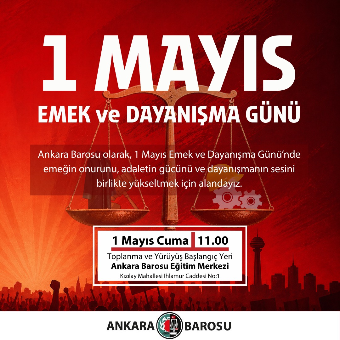 ANKARA BAROSU OLARAK, 1 MAYIS EMEK VE DAYANIŞMA GÜNÜ’NDE EMEĞİN ONURUNU, ADALETİN GÜCÜNÜ VE DAYANIŞMANIN SESİNİ BİRLİKTE YÜKSELTMEK İÇİN ALANDAYIZ