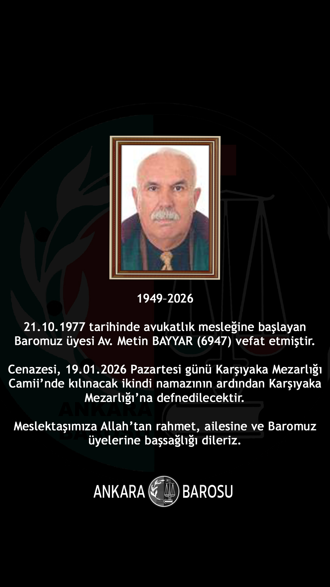 21.10.1977 tarihinde avukatlık mesleğine başlayan Baromuz üyesi Av. Metin BAYYAR (6947) vefat etmiştir. Cenazesi, 19.01.2026 Pazartesi günü Karşıyaka Mezarlığı Camii’nde kılınacak ikindi namazının ardından Karşıyaka Mezarlığı’na defnedilecektir. Meslektaşımıza Allah'tan rahmet, ailesine ve Baromuz üyelerine başsağlığı dileriz.