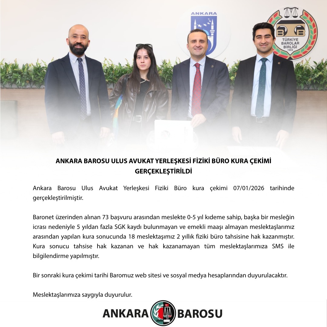 Ankara Barosu Ulus Avukat Yerleşkesi Fiziki Büro kura çekimi 07/01/2026 tarihinde gerçekleştirilmiştir.