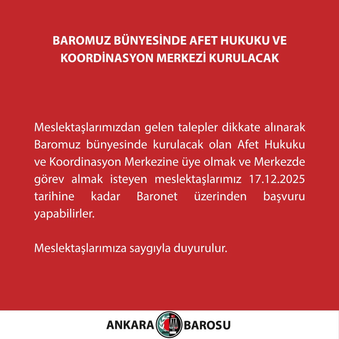 Meslektaşlarımızdan gelen talepler dikkate alınarak Baromuz bünyesinde kurulacak olan Afet Hukuku ve Koordinasyon Merkezine üye olmak ve Merkezde görev almak isteyen meslektaşlarımız 17.12.2025 tarihine kadar Baronet üzerinden başvuru yapabilirler. Meslektaşlarımıza saygıyla duyurulur.