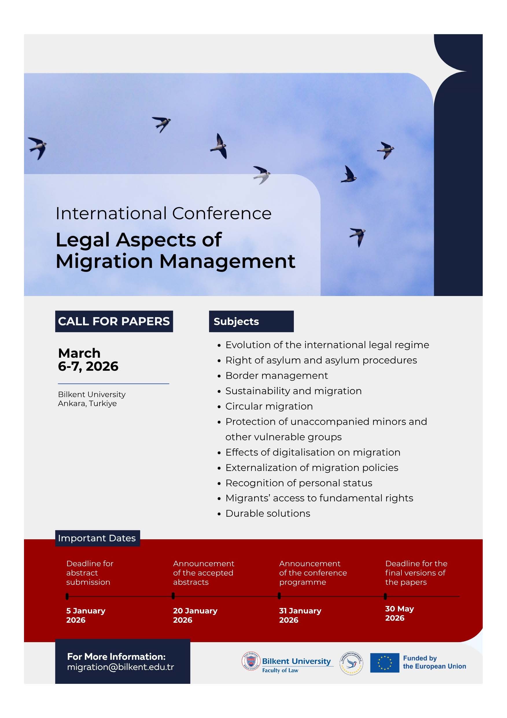 Bilkent Üniversitesi Hukuk Fakültesi ve Jean Monnet Kürsüsü tarafından 6-7 Mart 2026 tarihlerinde Üniversitemizde düzenlenecek olan "Legal Aspects of Migration Management" konulu uluslararası konferans düzenlenecektir.