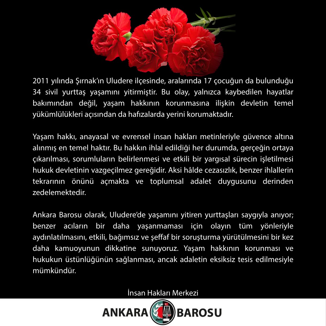 Ankara Barosu olarak, Uludere’de yaşamını yitiren yurttaşları saygıyla anıyor; benzer acıların bir daha yaşanmaması için olayın tüm yönleriyle aydınlatılmasını, etkili, bağımsız ve şeffaf bir soruşturma yürütülmesini bir kez daha kamuoyunun dikkatine sunuyoruz. Yaşam hakkının korunması ve hukukun üstünlüğünün sağlanması, ancak adaletin eksiksiz tesis edilmesiyle mümkündür.