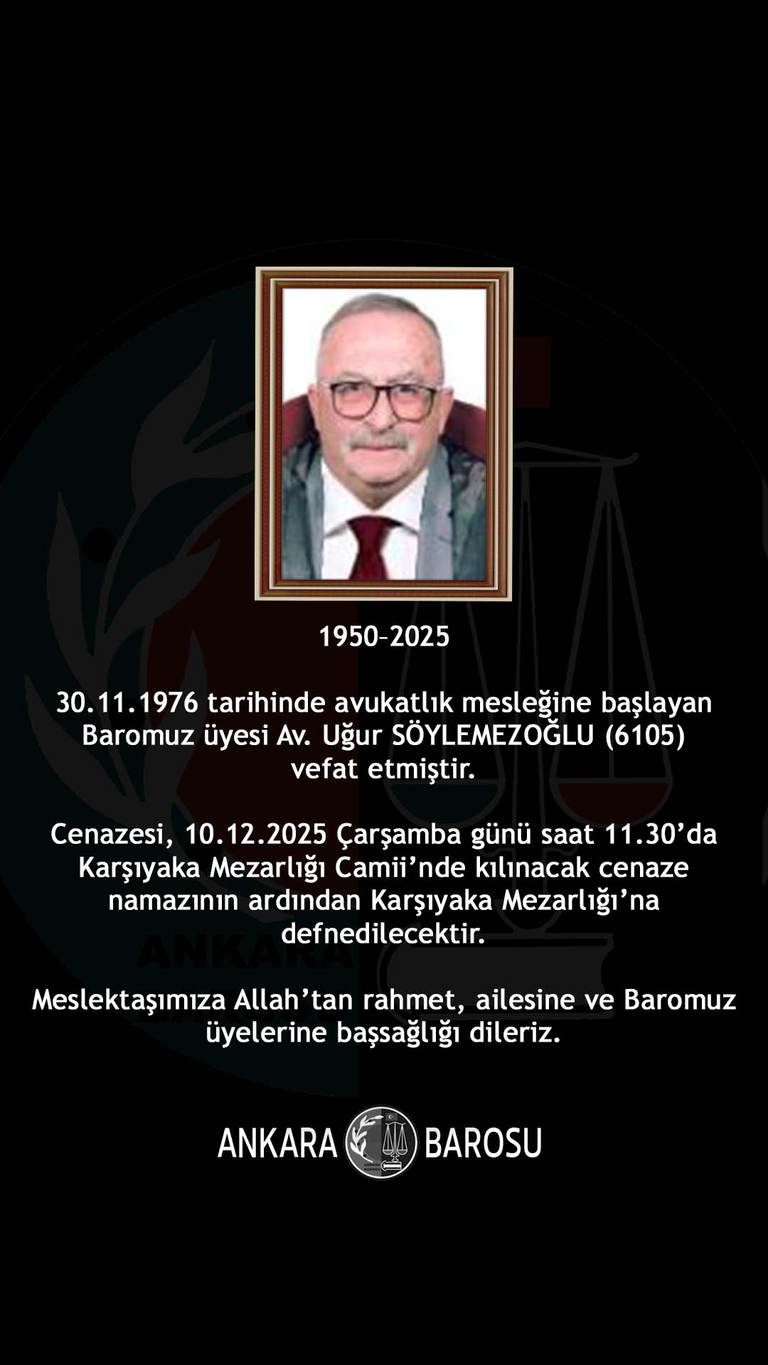 BAROMUZ ÜYESİ AV. UĞUR SÖYLEMEZOĞLU (6105) VEFAT ETMİŞTİR.
